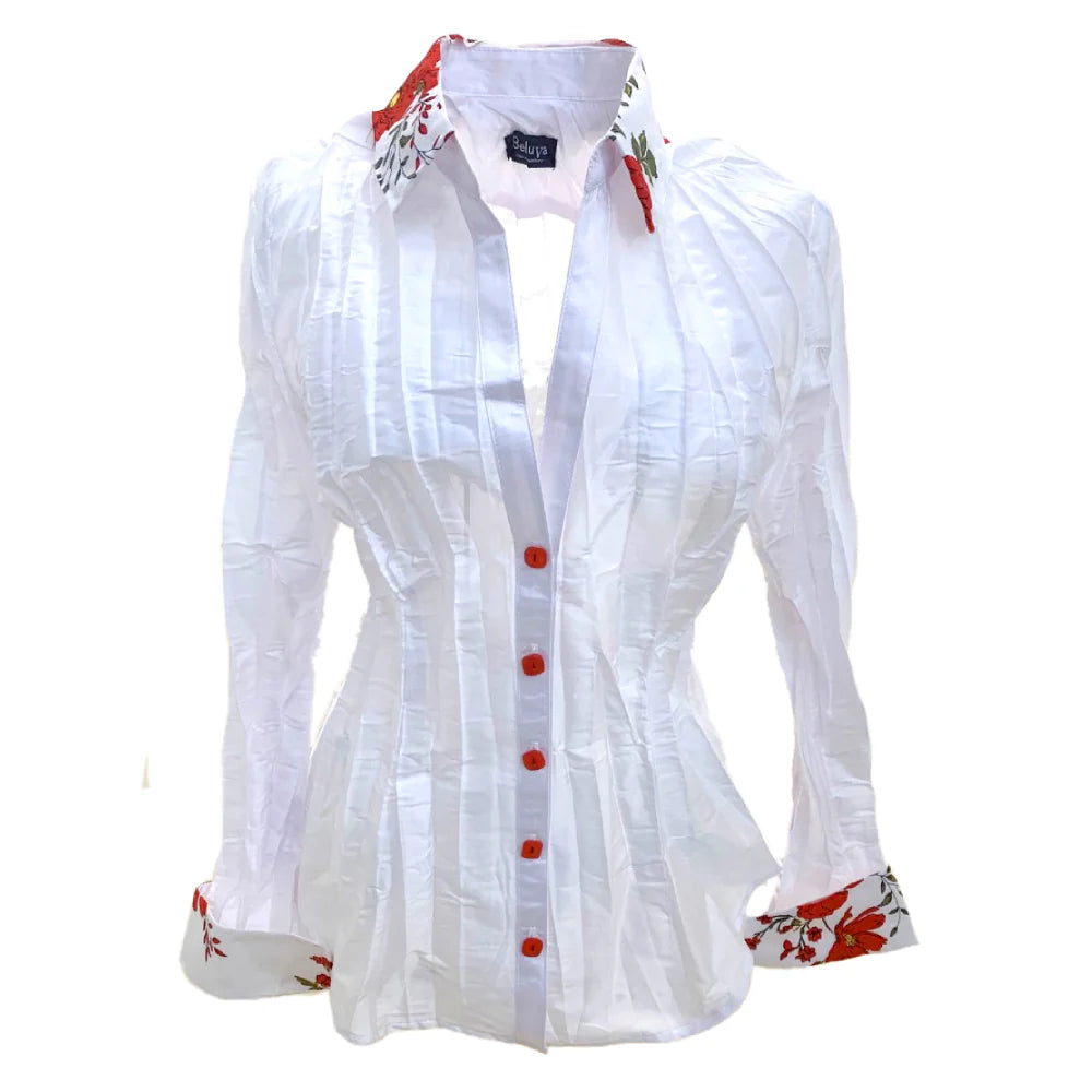 Firuzé Hariri opened her first boutique in the 1970's, on San Francisco’s vibrant and elegant Union Street. In 1996, at the height of the tech boom, she began designing her own line of novelty shirts and jackets, called Beluva. Her pieces incorporated practicality with novelty, appealing to her new and growing list of Silicon Valley clients. Her signature Beluva, easy-to-care-for shirts are proudly made in the USA. The Belden shirt features a classic button-down silhouette with long sleeves and a pointed collar. The collar and cuffs have an eye-catching red floral pattern. Walk out the door confident in this top. The distinctive permanently pleated texture is created by hand and is not designed to withstand heat.