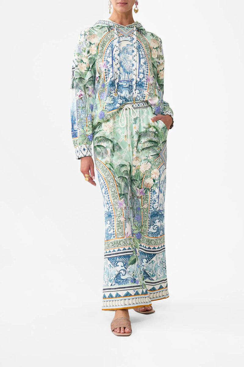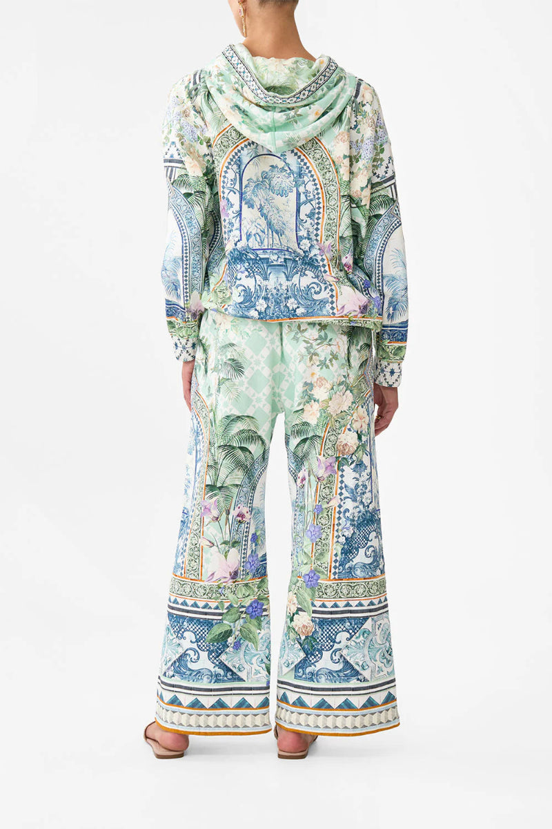 Designed in Australia, The Jardim Party Straight Leg Track Pant invites you to the Palacio De Estoi, Portugal's "Pink Palace," weaving romantic florals with rococo arches and intricate tiles, echoing the whimsy of Versailles-style gardens. Lovingly handcrafted, these straight-leg track pants marry comfort with luxury. An elasticated waistband, tassel details, and stitched pockets ensure versatility, while a streamlined leg enhances the silhouette.