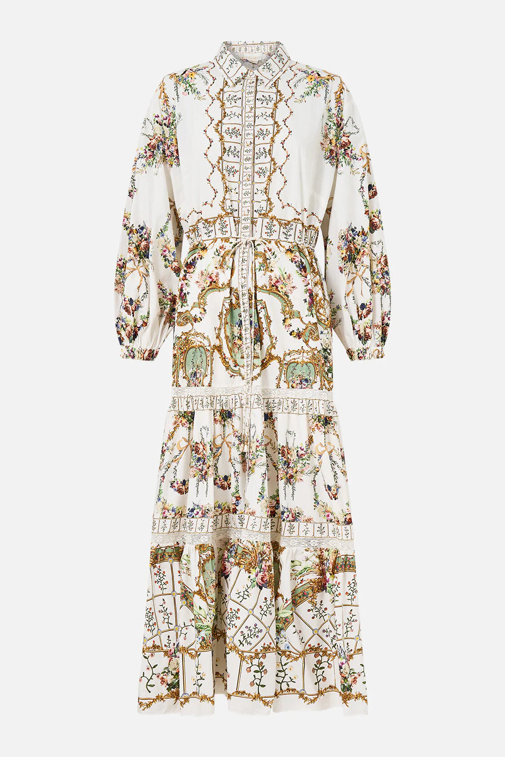 Designed in Australia, the Dressing Room Drama Tiered Long Shirt Dress unveils a black base fused with florals and gilded arches, echoing the regal opulence of the Palace of Queluz—a poetic nod to throne rooms and the queen's dressing sanctuary. Lovingly handcrafted, this lavish maxi dress features a relaxed fit throughout the body into a flowy tiered full length skirt. Paired with a soft tailored collar, button front detail and blouson sleeves, this CAMILLA shirt dress exudes luxury.