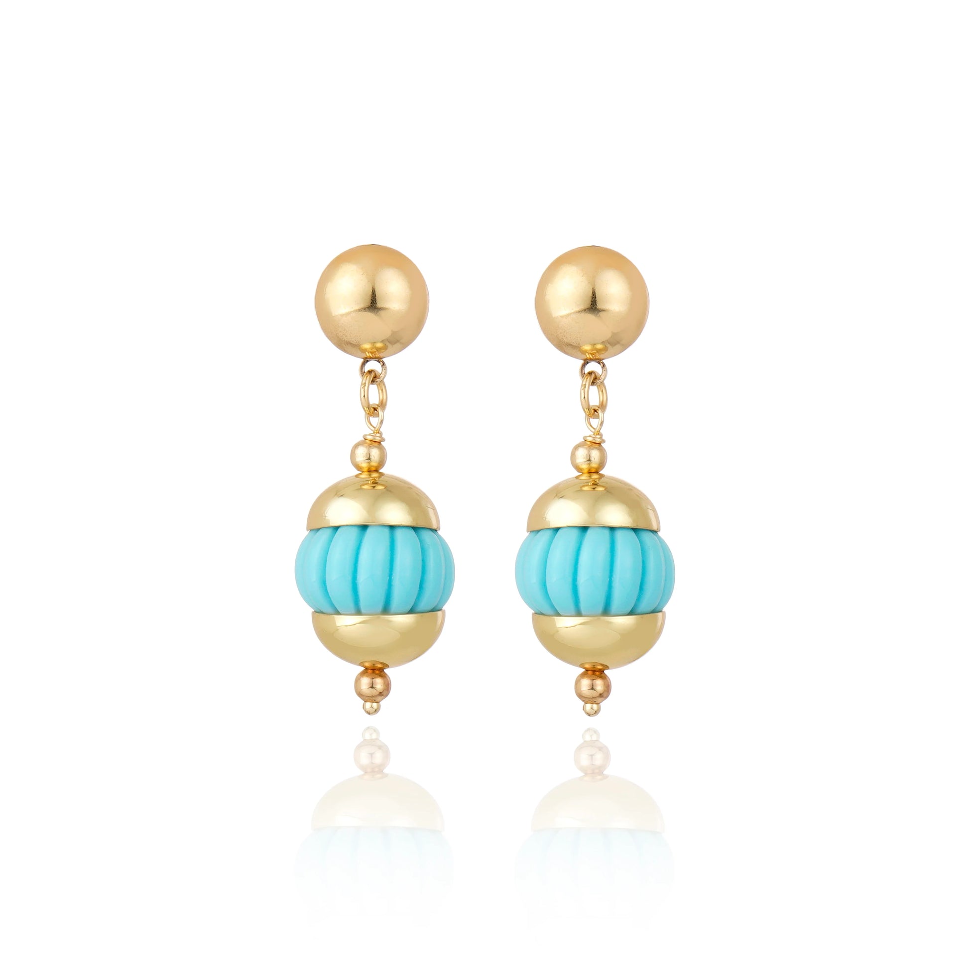 The Portinari Earrings Turquoise combine sculptural form with vibrant color in a striking drop silhouette. Crafted in gold-plated bronze, the design features a pavé crystal stud that leads to a bold turquoise-textured element framed by polished gold accents. The contrast between luminous turquoise and sparkling crystals creates a sophisticated balance of color, shine, and movement.