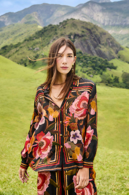 Embrace the playful spirit of FARM Rio with this Black Chenille Flowers Shirt, where bold blooms in warm reds, pinks, and ochres dance across an eco-conscious Lenzing Ecovero viscose. Its relaxed silhouette, adorned with a classic collar neckline, flows effortlessly, while the rich chenille embroidery adds a tactile depth that invites touch. This top is a vibrant celebration of nature’s beauty, designed to inspire joyful moments every day.