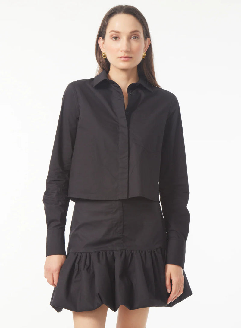Tuck in your favorite tee for a more laid-back vibe.Elevate your wardrobe with the Maxine Mini Skirt by GILNER FARRAR, a chic choice for workwear or travel. Crafted from 100% cotton, this solid black skirt is designed with a stylish front zip and hook and eye closure. Its distinctive ruffled bubble bottom hem adds a delightful flair, making it a perfect fit for spring occasions.