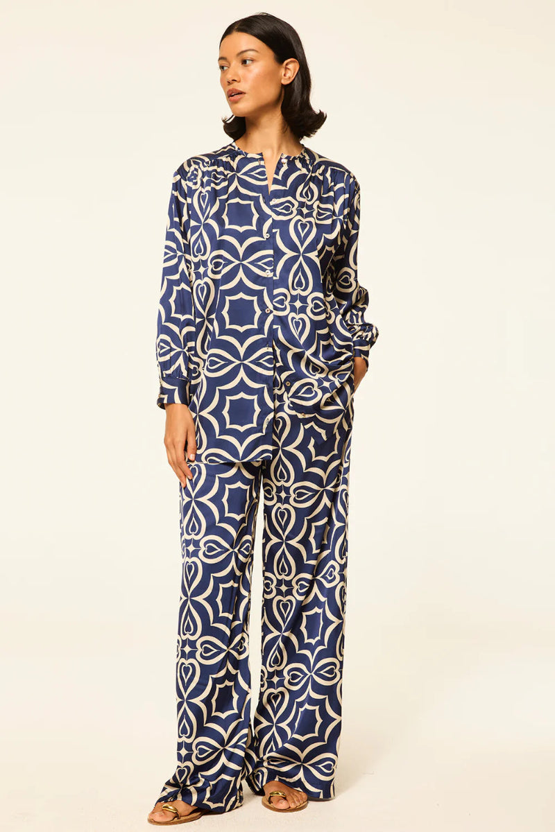 Our Teodora top brings effortless sophistication to your wardrobe in our Blue Mosaic Tile–printed satin. Designed with a high neckline, button front, and long sleeves with button cuffs, it’s a versatile piece that pairs perfectly with the coordinating Reshma pant or your favorite jeans for a look that’s both chic and timeless.