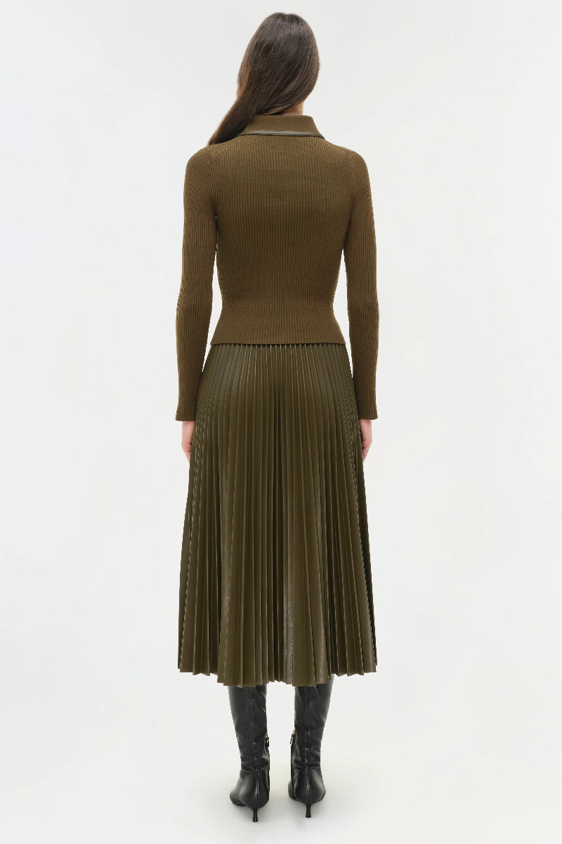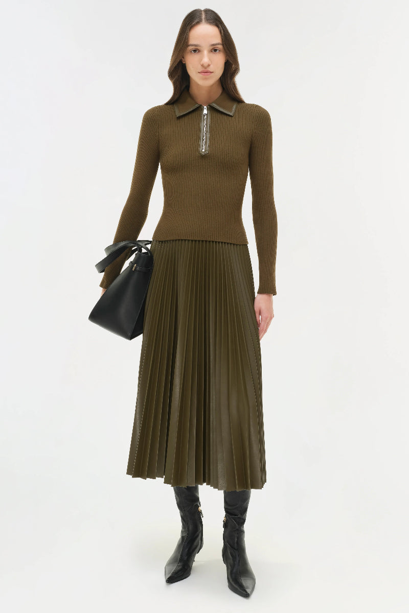 A long sleeve top in a ribbed knit with a classic spread collar and partial zip front closure design. Banded at the waist.